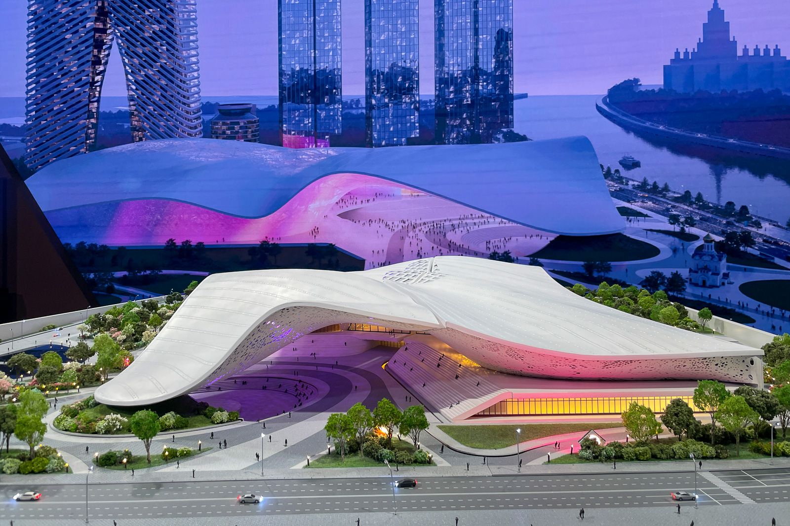 Акцентная деталь проекта – мультимедийный фасад. Гигантский экран будет адаптироваться под происходящие события и показывать от государственной символики в дни национальных праздников до тематических видеоинсталляций во время проведения культурных мероприятий.